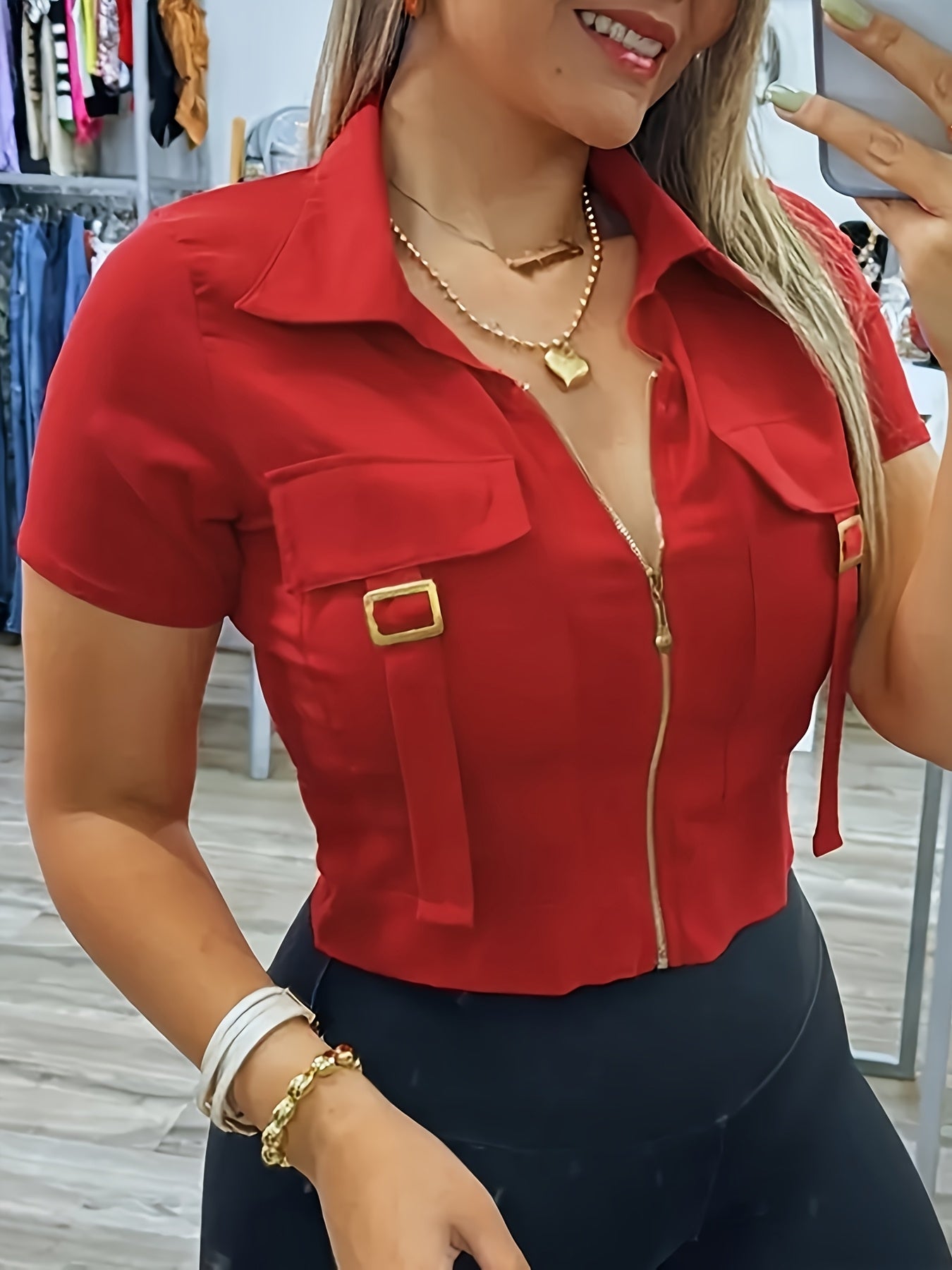 Women's Casual Zip-Up Shirt - Vibrant Red with Pockets & Golden-Tone Details