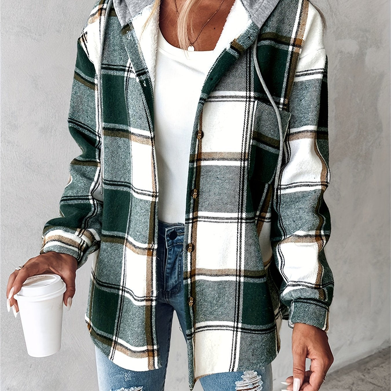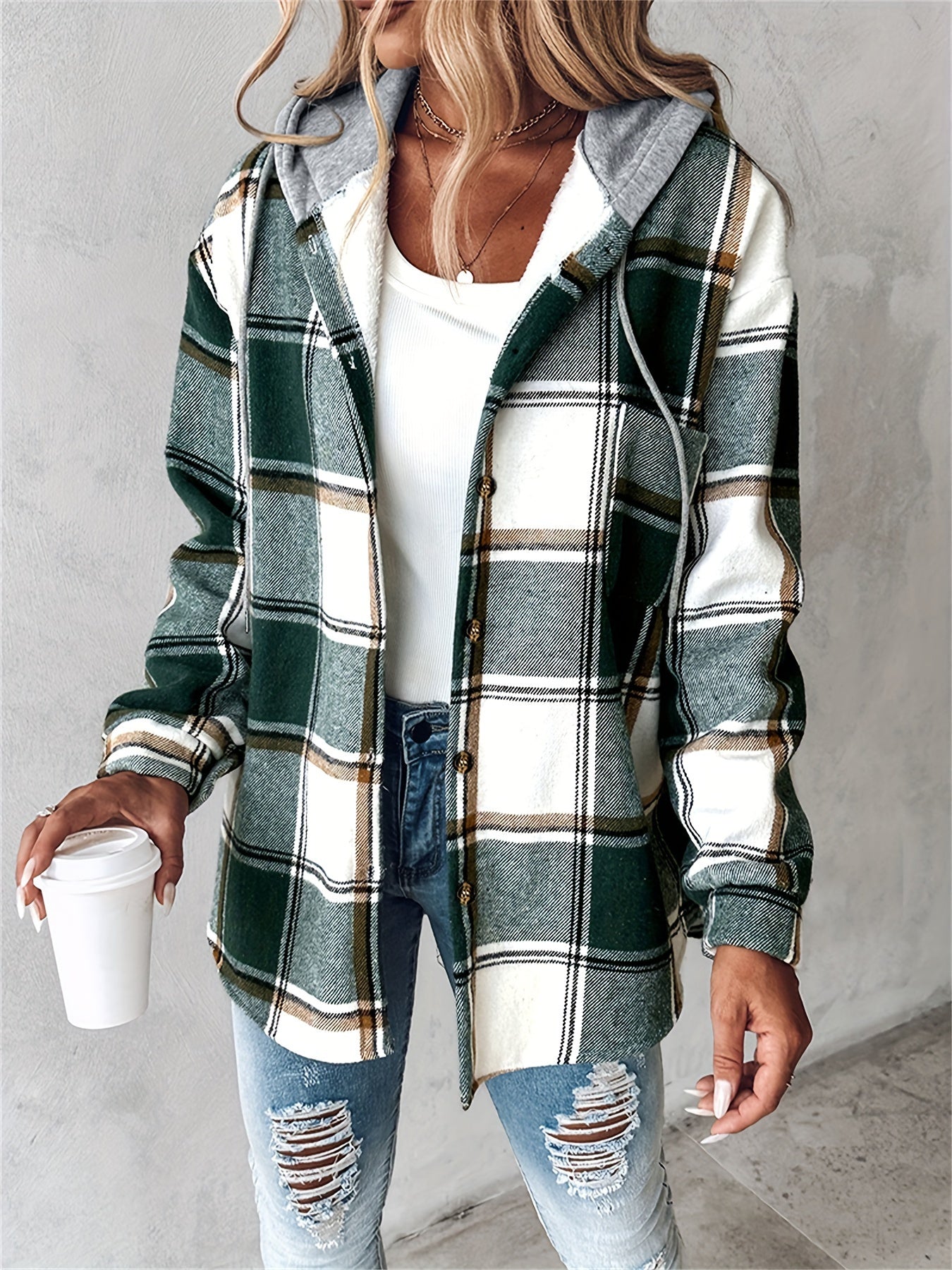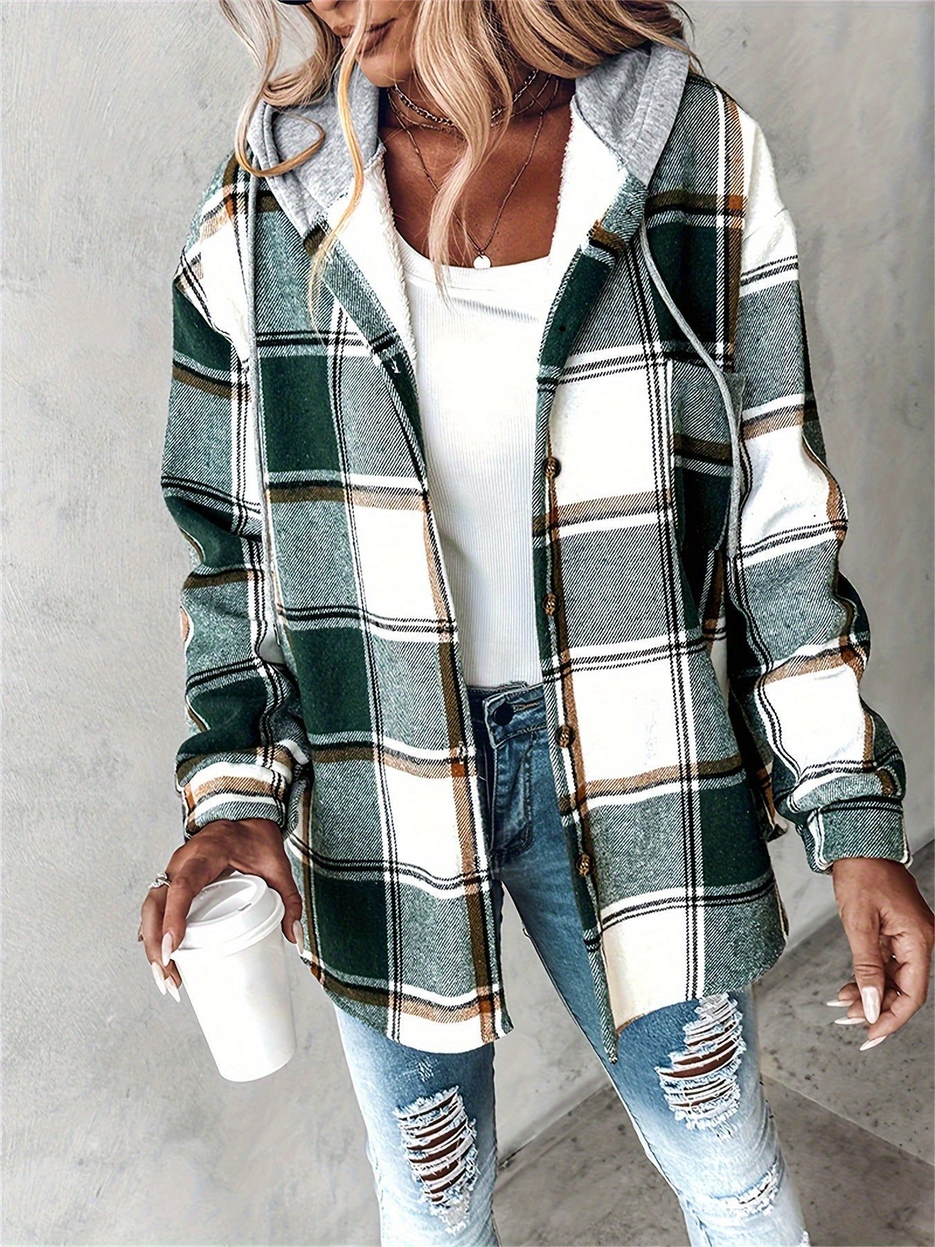 Embrace the cozy style of our Women's Retro Plaid Shacket Jacket, featuring a fleece-lined hood for added warmth during the fall and winter seasons. This versatile outerwear piece combines a timeless plaid design in green, white, black, and beige, making it a perfect addition to your seasonal fashion wardrobe. The comfortable button closure and adjustable drawstring waist provide a flattering fit, while being machine washable ensures convenience for daily wear.