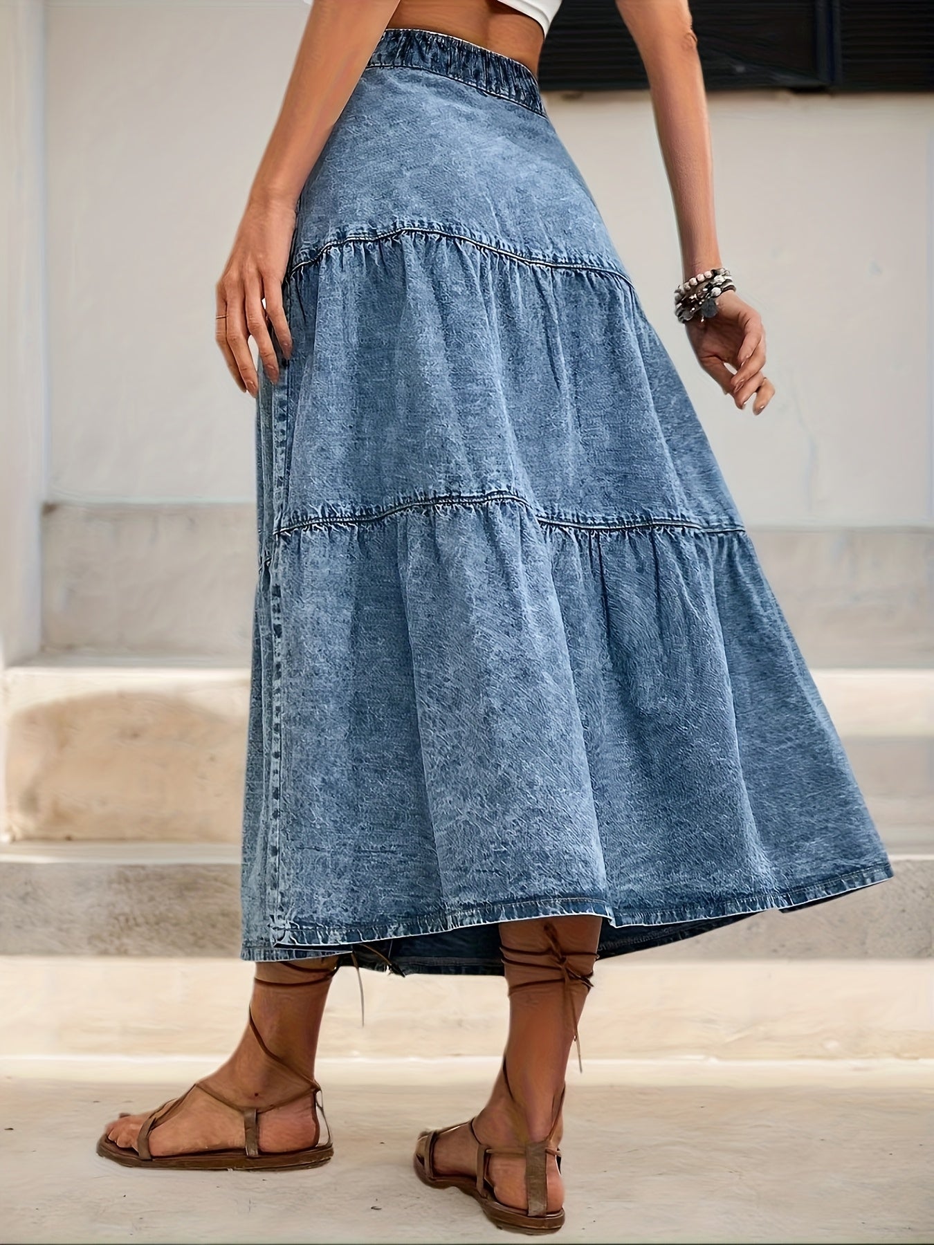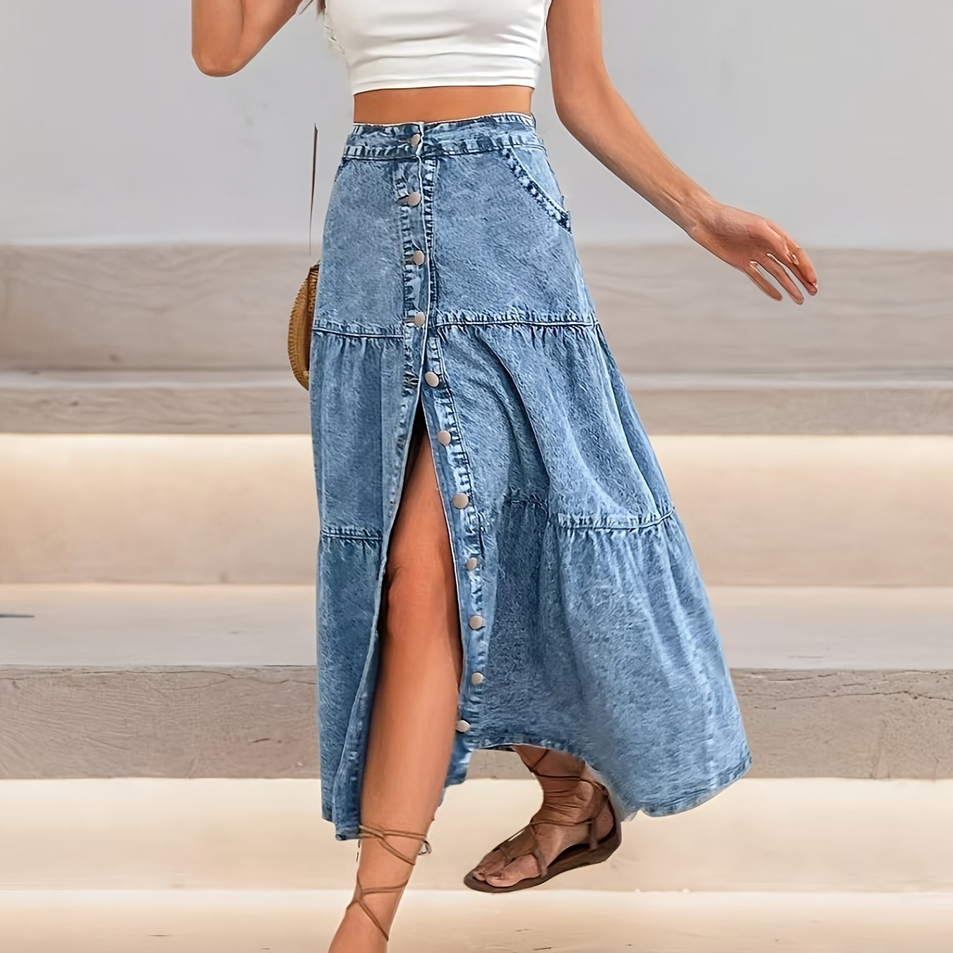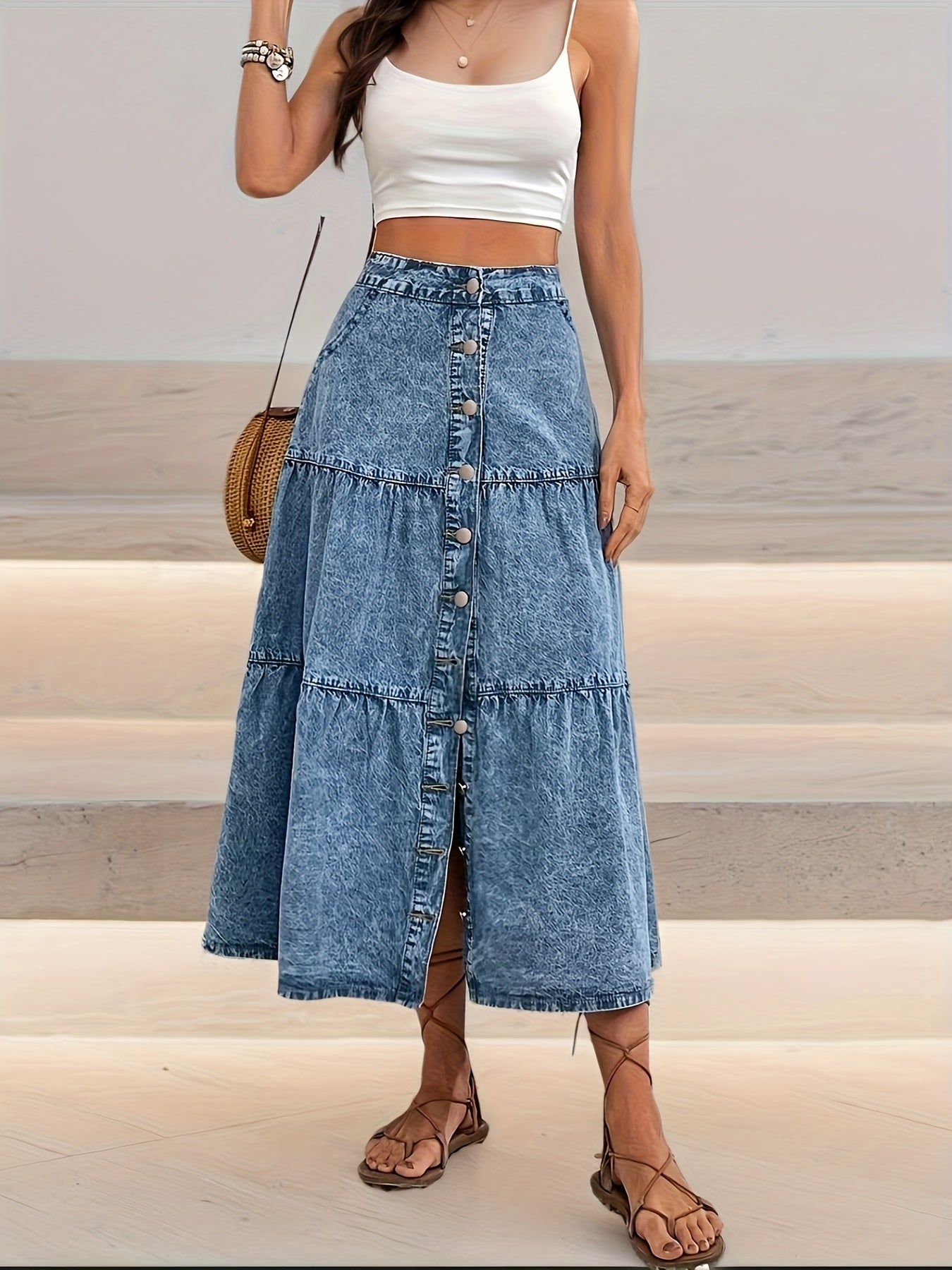 Introducing the Women's Elegant High-Waisted Skirt, a perfect blend of style and comfort. Crafted from 80% cotton, this midi-length skirt features a sophisticated front button closure, making it an ideal choice for the spring, summer, and fall seasons. With its regular fit and layered design, it accentuates your femininity while providing ease of movement.