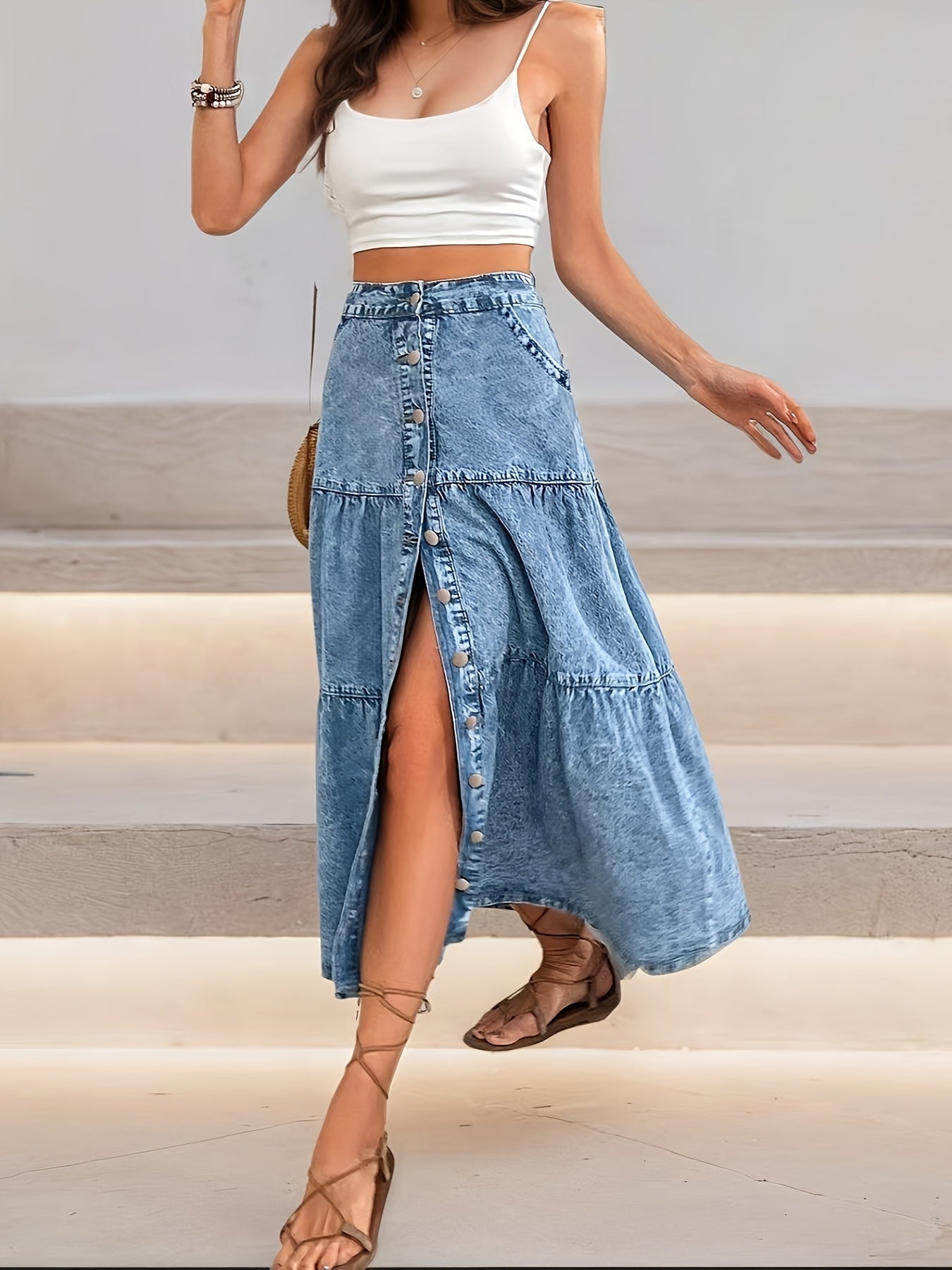 Women's Elegant High-Waisted Skirt - Front Button Closure, Midi Length
