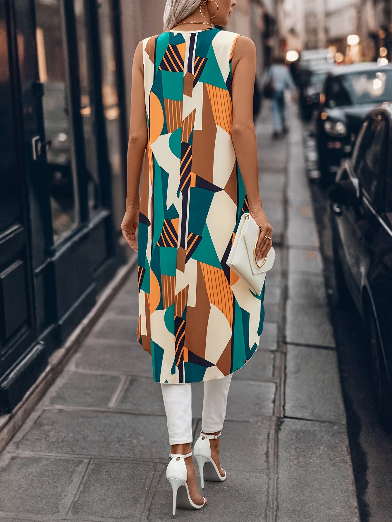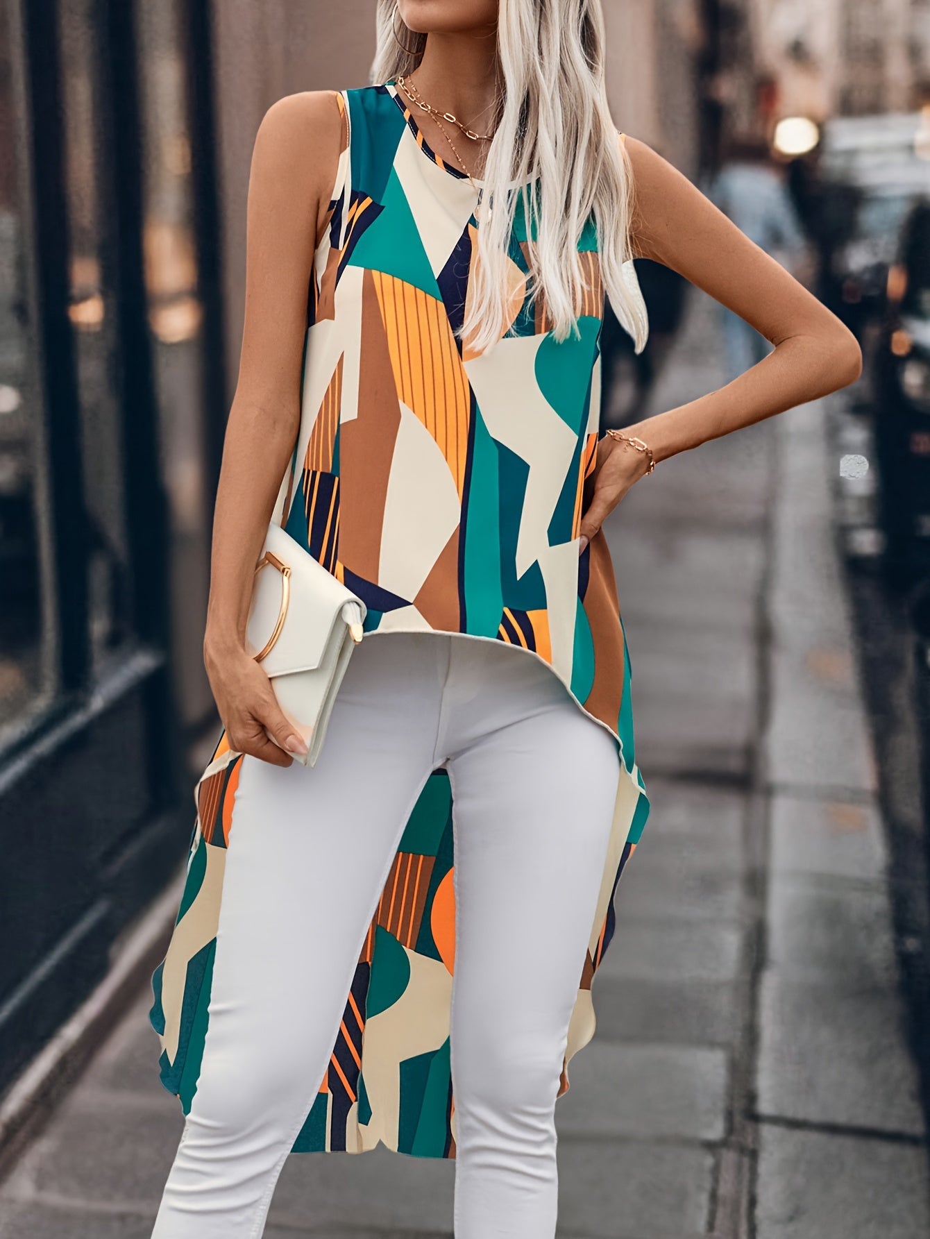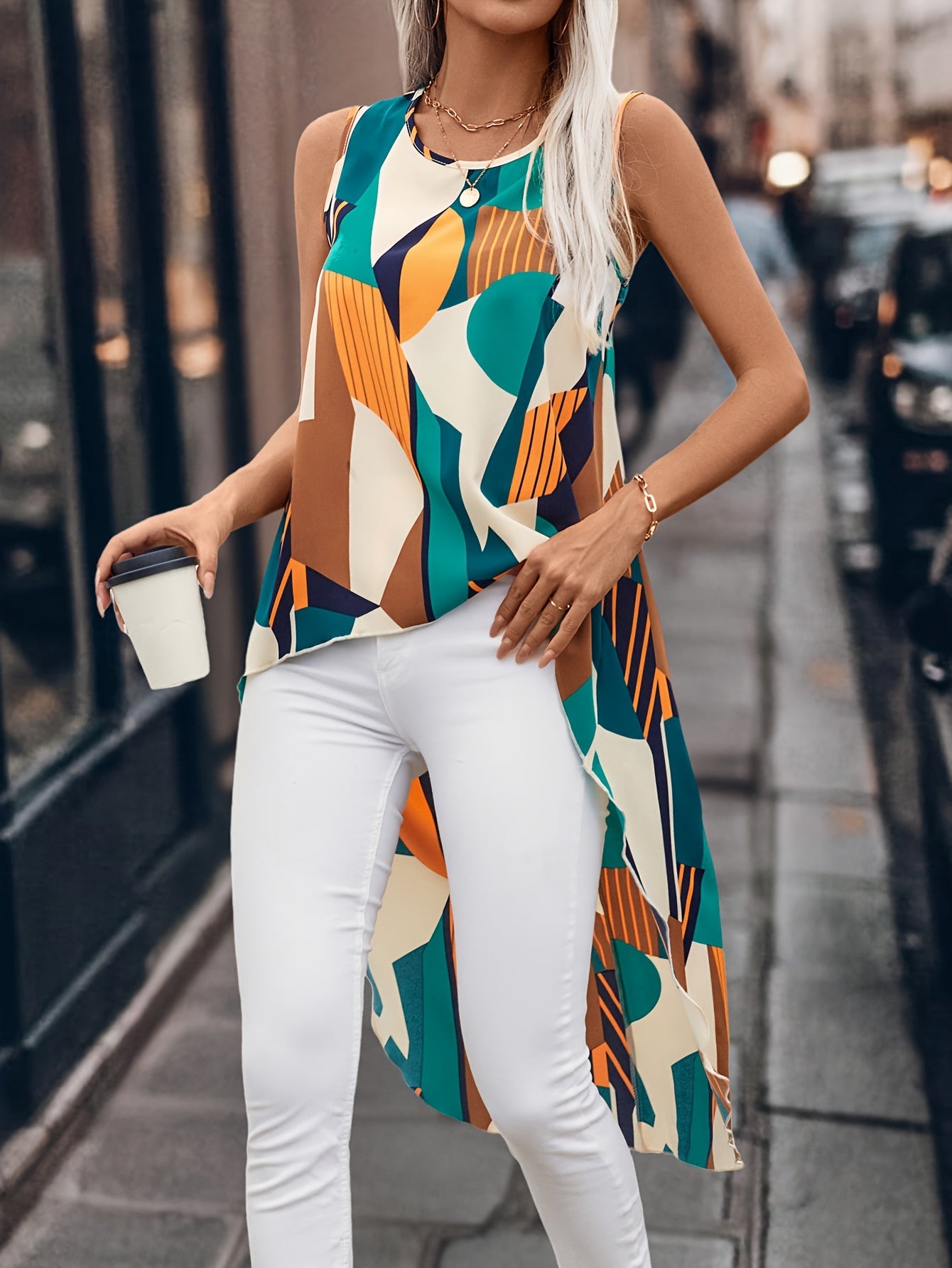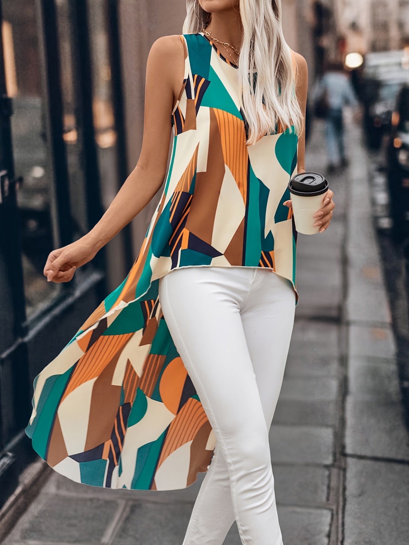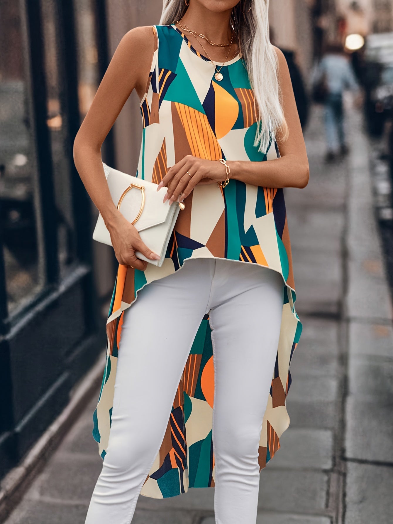 Introducing the Women's Color Block High-Low Tank Top, a perfect blend of casual elegance and stylish comfort. This versatile sleeveless top is made from 100% polyester, ensuring a long-lasting and easy-to-care-for garment. The unique geometric pattern and high-low design make it a trendy choice for any occasion.
