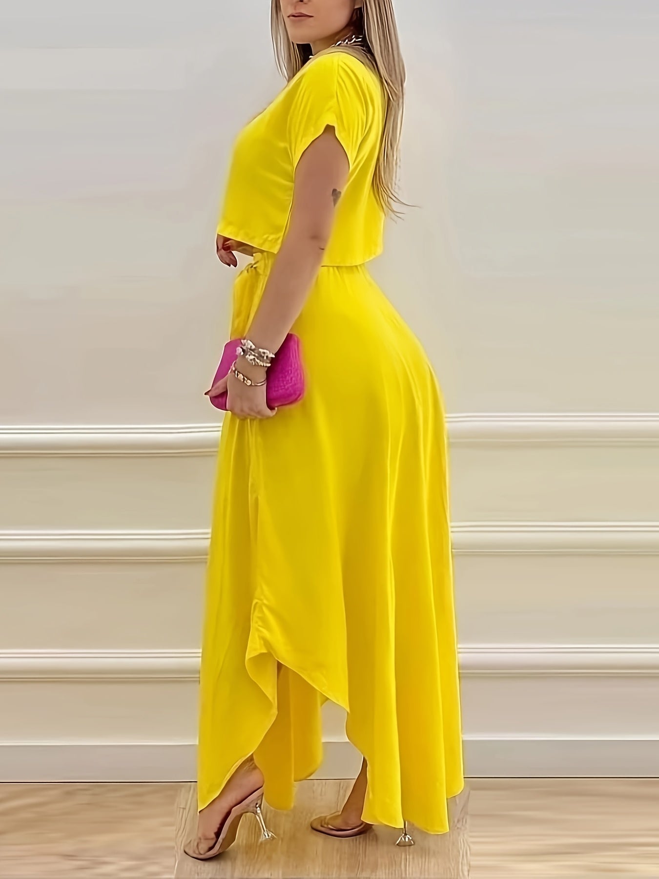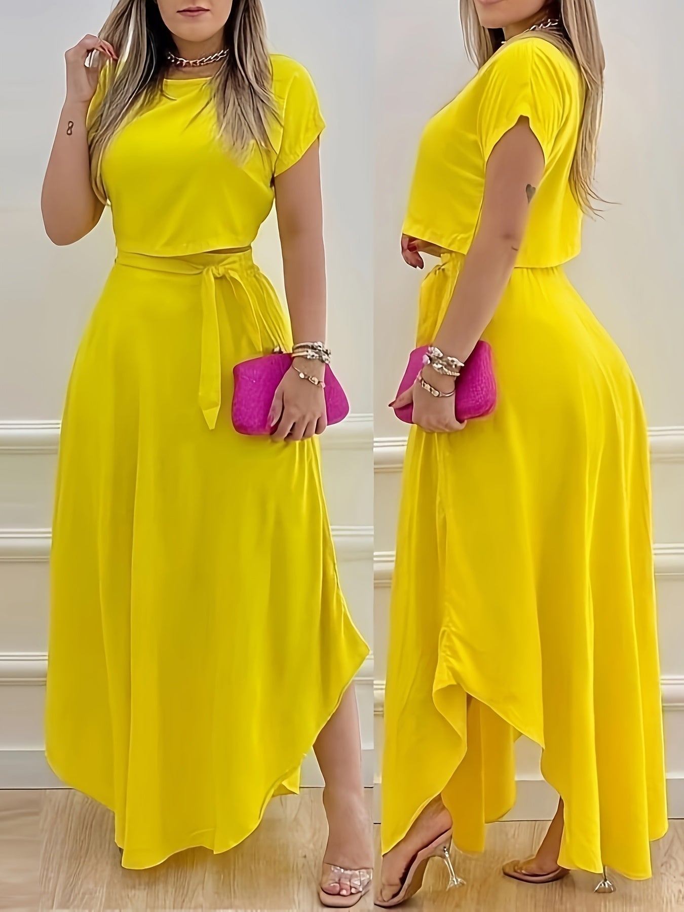 The Women's Vibrant Yellow Casual Dress Set is the perfect addition to your spring and summer wardrobe. Designed with 100% polyester, this mini dress features a stylish ruffled design complemented by chic accessories, ensuring you stand out in every casual setting.